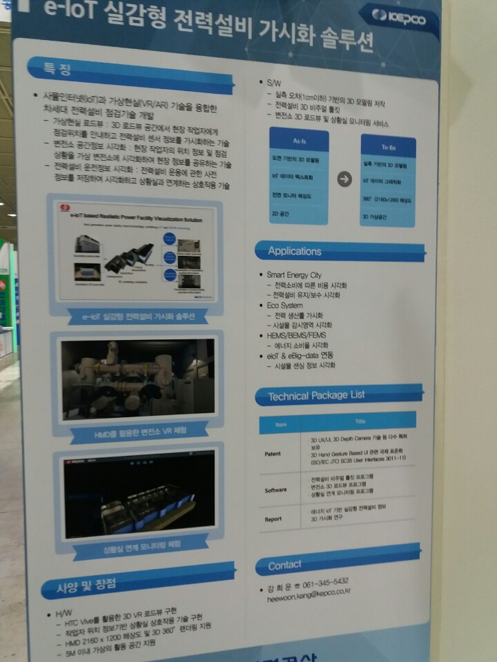 한국전력은 5월 10일(수)부터 12일(금)까지 삼성동 코엑스(COEX)에서 열리는 '2017 국제 전기전력 전시회'에 참가해 수전설비 모니터링 시스템과 IoT 기반 수전설비 상시감시 및 데이터 자동전송장치, 콤팩트형 지중 케이블 부분방전 진단장비 등을 선보였다.