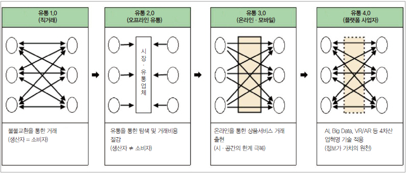 유통 4.0시대의 도래에 따라, 유통산업의 사업모델이 생산자에게서 소비자로 상품과 서비스를 전달하는 ‘기업·소비자 거래(B2C) 모델’에서 소비자의 니즈를 생산자에게 전달하는 ‘고객과 기업(C2B) 모델’로 확대되고 있으며, 이에 따라 유통산업이 단순히 상품과 서비스의 거래중개자가 아닌 생산자와 소비자를 연결해주는 플랫폼 산업으로 변모하고 있다.