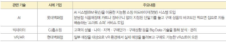 ▲ 표1. 국내 주요 유통기업의 4차 산업혁명 기술 적용 사례