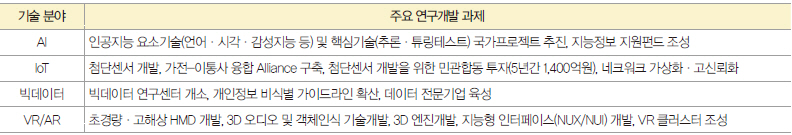 ▲ 표 2. 4차 산업혁명 기술분야별 연구개발 현황(‘17년 산업부, 미래부 업무보고)