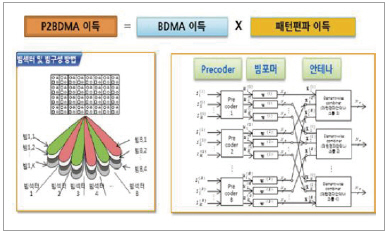 집적된 패턴 편파 안테나를 반파장 간격으로 배열해 패턴 편파 안테나마다 특정한 가중치를 가한 신호를 주면 방향성을 지니는 빔을 형성해 수신 신호 품질을 향상시킬 수 있다. 또한 동시에 여러 가중치를 사용해 멀티 빔을 만들고 각 빔에 서로 다른 MIMO 신호를 전송한다. 이런 방식으로 공간을 여러 빔으로 분할하고 패턴 편파 안테나를 이용해 빔 이득과 MIMO 이득을 동시에 얻는 패턴편파 BDMA 기술을 개발했다. 연구 결과, 빔 이득과 패턴 편파 이득은 서로 완전히 독립적이지 않기 때문에 최적의 설계를 통해서 빔 이득과 MIMO 이득을 동시에 얻을 있다는 것을 알게됐다. 또한 패턴 편파 BDMA 기술을 검증하기 위해서 상용 EPC, 상용 LTE 모뎀, 빔포머, 패턴편파 안테나로 구성된 기지국과 상용 단말을 포함하는 테스트베드를 구축해 12개의 빔 각각에서 2배의 MIMO 이득을 얻을 수 있음을 확인했다.