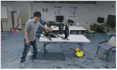 ‘공간증강 인터랙티브 학습 시스템’은 공간을 인식해 가상 콘텐츠를 증강하고 실사 영상을 변형시켜 보다 실감나는 학습 환경을 제공하는 시스템으로, 공간을 인식하고 공간에 놓인 사물들을 객체단위로 구분하는 기능을 제공한다. 특히 공간 속의 사람은 동작을 인식하고 3차원 모델링에 기반한 가상 객체와의 인터랙션 기능을 지원한다. 그래서 실제 공간에 있는 테이블 위에서 가상의 펭귄이 걷고 학습자가 움직이면 물고기가 도망가며, 가상의 지진에 의해 실제 공간의 바닥이 갈라지는 등 실사와 가상이 어우러진 여러 가지 콘텐츠를 개발해 자연스럽게 학습이 이뤄지도록 할 수 있다.
