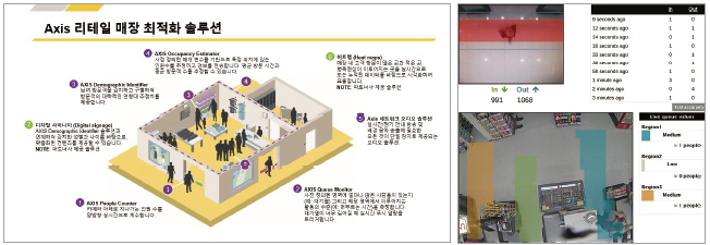 엑시스의 모든 리테일 분석 솔루션은 IP 네트워크와 연결되기 때문에 외부에서도 원격으로 데이터를 확인할 수 있다. 특히 엑시스는 고객의 다양한 선호 사항과 매장의 크기, 조명 조건에 맞게 다양한 카메라 모델을 제공하여 정확한 수치 데이터를 제공한다. 애플리케이션이 네트워크 카메라에 설치되어 있기 때문에 서버와 같은 별도의 하드웨어가 필요하지 않으며, 고객이 원하는 대로 측정 조건을 설정할 수 있고 위치 변경이나 추가 확장이 간편해 유지관리도 편리하다.