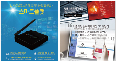 스마트플랫은 다양한 디스플레이와 구동장치의 별도 구매 및 구성이 가능하다. 또 웹기반의 전용 관리프로그램으로 언제 어디서나 쉽고 빠르게 화면 관리를 할 수 있다. 뿐만 아니라 다양한 화면 레이아웃, 배경, 효과 제공으로 다채롭고 완성도 있는 화면 제작도 가능하다. 편리하고 쉬운 관리 기능 대비 비용이 저렴하고, TV만 있으면 저렴한 비용으로 전자메뉴판, 게시판으로 활용 가능하다.
