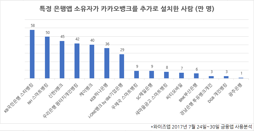 조사에 따르면 ‘KB국민은행 스타뱅킹’을 보유한 사람 중에 ‘카카오뱅크’를 설치한 사람이 가장 많았으며 58만 명이었다.