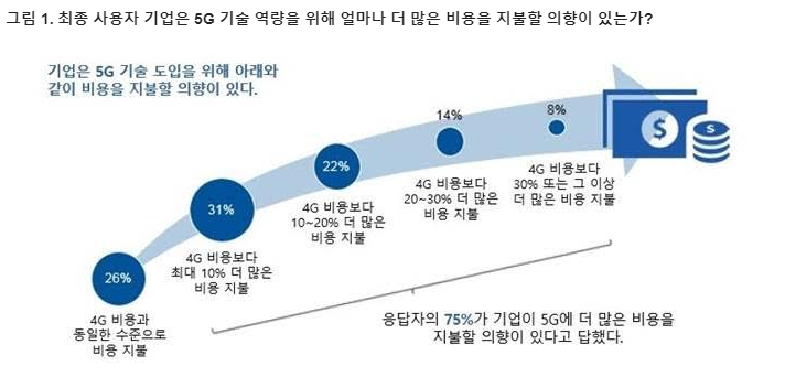 IT시장 조사 업체 가트너(Gartner Inc.)가 최근 발표한 설문조사 결과에 따르면 최종 사용자 기업의 75%가 5G 모바일 기능에 더 많은 비용을 지불할 의향이 있는 것으로 나타났다. 4G 대비 5G 기술에 더 많은 비용을 지불하지 않겠다고 답한 응답자는 24%에 불과했다.
