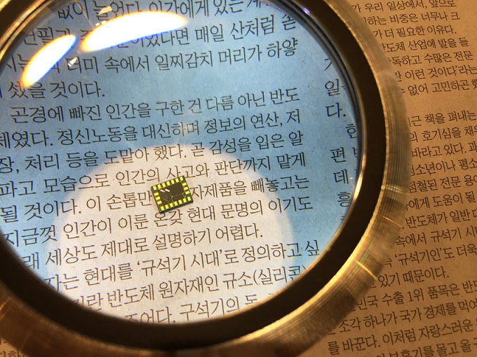 바른전자가 개발한 최소형 로라(LoRa) 모듈과 신문 활자를 확대경으로 확대한 사진
