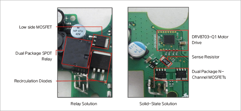 TI의 솔리드스테이트 모터 드라이버를 사용해서 모터 제어 시스템을 설계하면 PCB 솔루션의 크기를 줄일 수 있을 뿐만 아니라, 동일한 모듈로 더 많은 모터들을 제어할 수 있다. 또한 TI의 모터 드라이버 제품은 높은 통합성과 간단한 제어 기능을 갖추고 있어 개발자들이 현재 릴레이를 사용하고 있는 최신 브러시 DC 모터 컨트롤러 회로를 쉽고 빠르게 재설계할 수 있다.