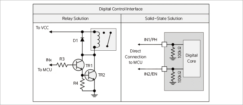 릴레이 솔루션에 동일한 입력 제어를 달성하기 위해서는 릴레이 내부의 솔레노이드 코일을 제어하기 위한 특정 전류 이득이 필요하다. 그림 3은 릴레이와 솔리드스테이트 드라이버를 MCU로 인터페이싱할 때 회로 토폴로지의 차이점을 보여준다.