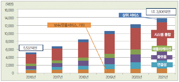 시장을 차지하는 비중이 높은 시스템 통합은 앞으로도 빅데이터와 IoT 시스템 활용 수요가 높아지면서 탄탄한 성장이 예상된다. 애초에는 데이터 수집과 PoC(콘셉트 검증) 안건이 중심이었지만, 본격적인 도입 안건의 증가에 따라 단가의 상승이 예상되어 향후 성장을 방해할 것으로 보인다. 앞으로는 시스템의 규모 및 적용 범위 확대, 기간 시스템(SoR) 연계가 수요 증가의 포인트가 될 것이다.