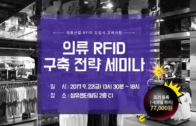 이번 세미나는 선착순 70명을 대상으로 진행되며, 의류업계 RFID 도입에 관심있는 분들은 의류RFID 구축 전략 세미나 홈페이지(https://goo.gl/rE2Azx)를 통해 등록할 수 있다.