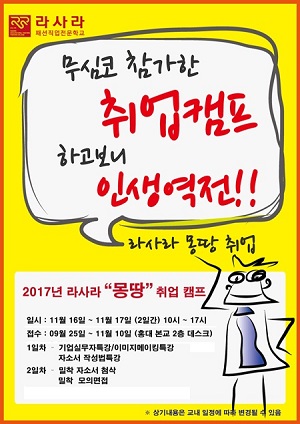 라사라패션직업전문학교는 11월16일부터 17일까지 이틀간 라사라 홍대캠퍼스에서 ‘2017 라사라 몽땅 취업캠프’를 개최할 예정이라고 밝혔다.