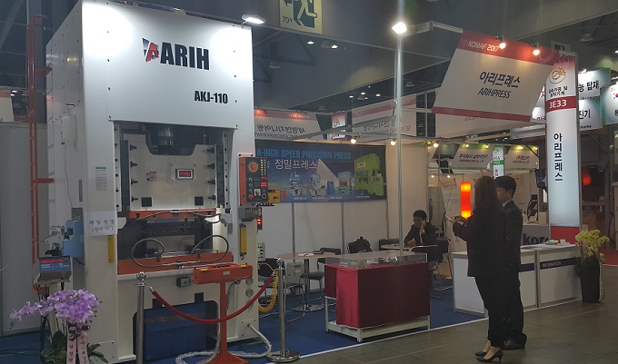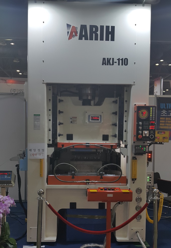 한국기계전에 참가한 아리프레스는 싱글 너클 프레스 AKJ 시리즈 중 AKJ-110 모델을 직접 전시해 관람객들의 관심을 모았다. 이 제품은 고정밀도와 최고의 내구성을 갖춘 주물프레임 및 무누유(오일 누유 0%)의 싱글 너클 프레스이다.