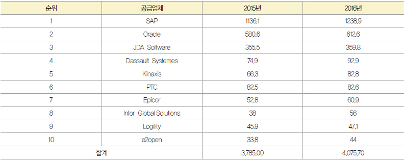 ▲ 표 1. 2016년 SCM 시장 전체 소프트웨어 매출 순위 (단위: 백만달러)