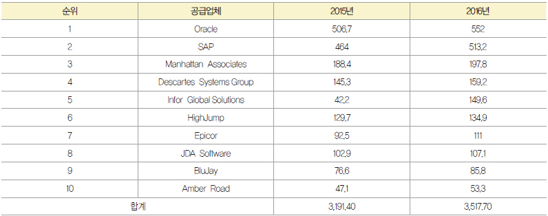 상위 5개 공급업체들은 2012년 이후 리스트를 장악하고 있으나, Infor가 GT Nexus를 인수하면서 2015년 10위권 밖에서 단숨에 4위에 올랐다. GT Nexus를 인수하면서 Infor의 매출은 2억 4,300만 달러를 기록했다. 1위부터 3위까지는 SAP(29억 3,000만 달러), 오라클(15억 5,000만 달러), JDA(4억 7,600만 달러)가 각각 차지했다. 5위는 맨하탄 어소시에이츠가 2억 900만 달러로 뒤를 이었으며, Epico가 18% 증가한 1억 9,200만 달러를 기록했다. 이들 중 5개 업체가 25% 이상의 수익을 올린 것으로 나타났다.