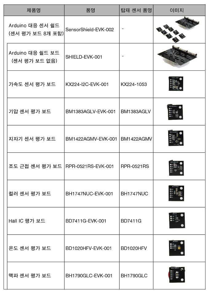 SensorShield-EVK-002는 고객들에게 호평을 받은 첫 번째 제품의 라인업을 리뉴얼해 내놓은 제품으로, 새롭게 추가한 맥파 센서 등, 양산 단계에 있는 로옴 그룹의 센서 8가지 제품을 각각 기판에 실장한 것과 오픈 플랫폼 접속용 쉴드 보드를 세트로 제공한다.