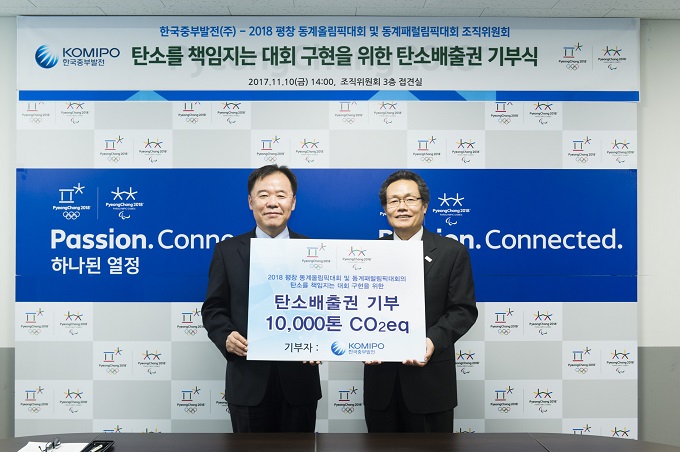한국중부발전은 지난 10일(금) 평창동계올림픽 조직위원회 평창 주사무소에서 청정개발체제(CDM) 사업으로 보유 중인 탄소배출권 1만톤을 2018 평창동계올림픽 및 동계패럴림픽대회 조직위원회에 기부했다.