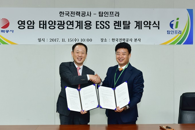 한국전력공사(사장 조환익)와 탑인프라(사장 양홍석)는 어제(15일) 한전 본사에서 태양광연계용 대용량 ESS 렌탈 계약을 체결했다.