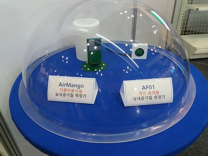 함께 선보인 휴대용 고정밀 실내공기질 측정기 ‘AF01’ 시스템은 인체에 영향을 미치는 미세먼지(PM2.5)를 집안이나 소형 사무실 등에서 실시간으로 측정한 실내공기질 정보를 표시해주는 휴대용 고정밀 실내공기질 측정기다.