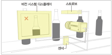 예를 들어, 양조장의 채움 수준 검사 시스템을 생각해 보자(그림 1). 각 맥주병이 검사 센서를 통과하며 이 센서는 스트로브 광을 비춰 병의 사진을 찍도록 비전시스템을 작동한다. 비전 소프트웨어는 이미지를 획득하고 메모리에 저장한 후, 이를 처리하거나 분석하고 병의 채움 수준에 따라 통과-실패 응답을 생성한다. 제대로 채워지지 않은 병, 즉 불량이 감지되면 시스템은 병을 거부하라는 신호를 전환기에 보낸다. 작업자는 디스플레이에서 불량 병을 확인하고 진행 중인 공정 통계를 볼 수 있다.