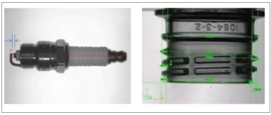 머신비전시스템은 객관적인 측정도 수행할 수 있다. 예를 들면, 점화 플러그 간극을 파악하거나 제조 공정에서 로봇이 부품을 정렬할 수 있도록 위치 정보를 제공한다. 그림 2는 머신비전시스템에서 오일 필터가 통과/실패하는 모습(오른쪽)과 브래킷의 중앙 탭 폭을 측정하는 모습(왼쪽)을 보여준다.