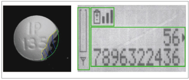 검사: 검사용 머신비전시스템은 제조된 제품에서 결함, 오염, 기능상 결점, 기타 이상현상을 감지한다(그림8). 이러한 예로는 의약제 결점 검사, 아이콘 검증이나 픽셀의 현재 상태 확인 표시, 역광의 대비 수준을 측정하는 터치스크린이 있다. 또한 머신비전은 식품 및 제약 산업에서 제품과 포장의 매칭, 병의 고리, 뚜껑, 밀봉의 안전성 점검 등 제품의 완성도를 검사할 수 있다.