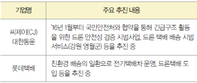 국내에서도 우본 뿐만 아니라, CJ대한통운 등 민간 기업에서 국내 여건에 맞는 드론 택배 서비스 상용화를 위한 연구를 진행 중이다(표2).