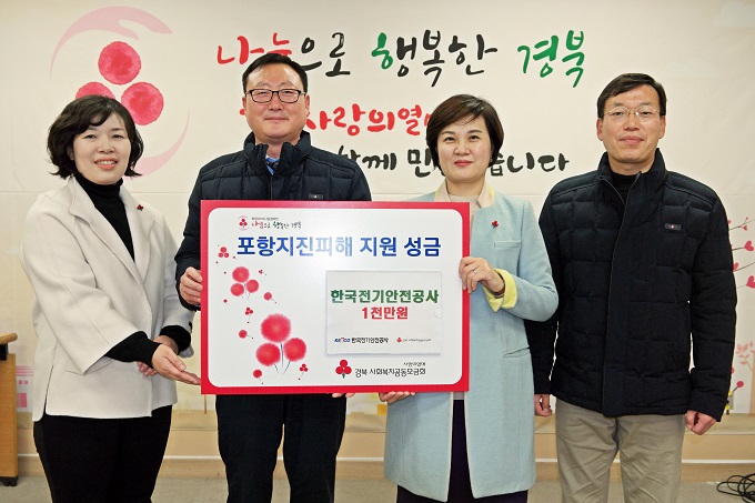 한국전기안전공사(사장직무대행 김성수)가 '포항 지진' 이재민돕기 성금으로 1천만 원을 기탁했다. 공사 대구경북지역본부(본부장 장보형)은 11월 28일, 경북사회복지공동모금회를 방문해 지진 피해 복구를 위한 성금을 전달하고, 이재민 대피시설 등에 대한 전기설비 점검 지원을 약속했다.