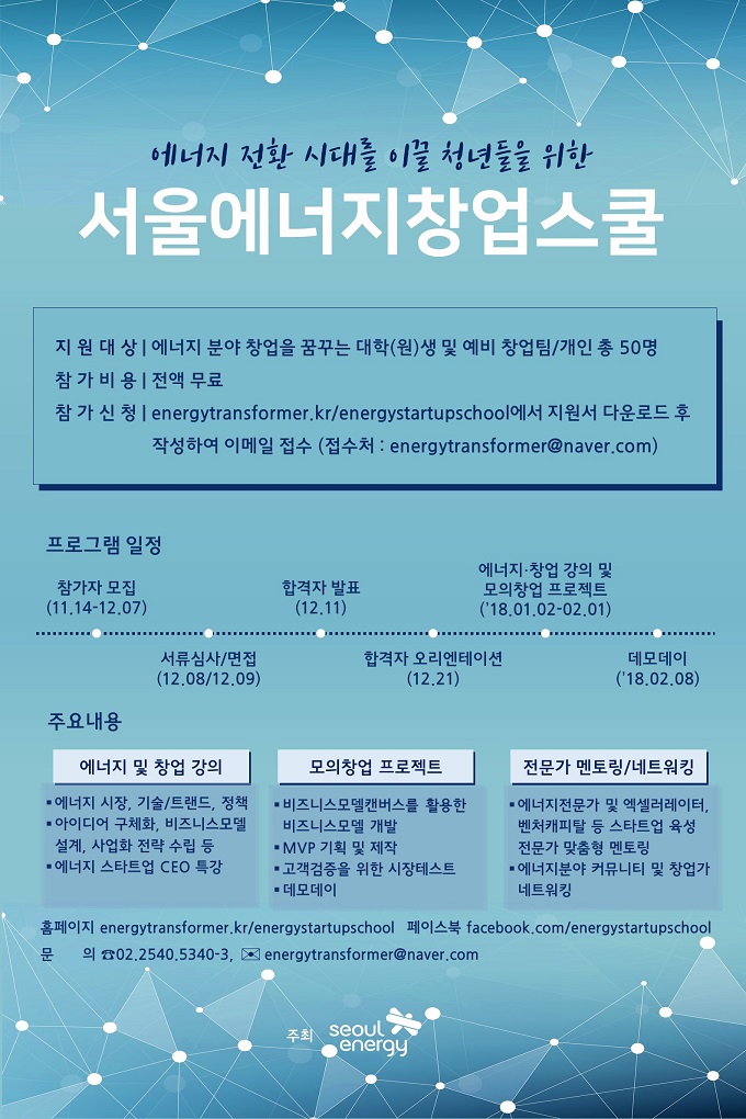 ‘서울에너지창업스쿨’은 에너지 전환 시대의 새로운 에너지 시스템을 선도할 청년들의 아이디어 개발을 지원하는 전문 교육 프로그램. 커리큘럼은 청년들이 에너지 분야를 쉽게 이해하고 다양한 에너지 솔루션을 도출 및 실현할 수 있도록 에너지/비즈니스 실무 전문가 강의와 이를 바탕으로 비즈니스 아이디어를 기획 및 실행하는 모의창업 과정으로 구성되어 있다.