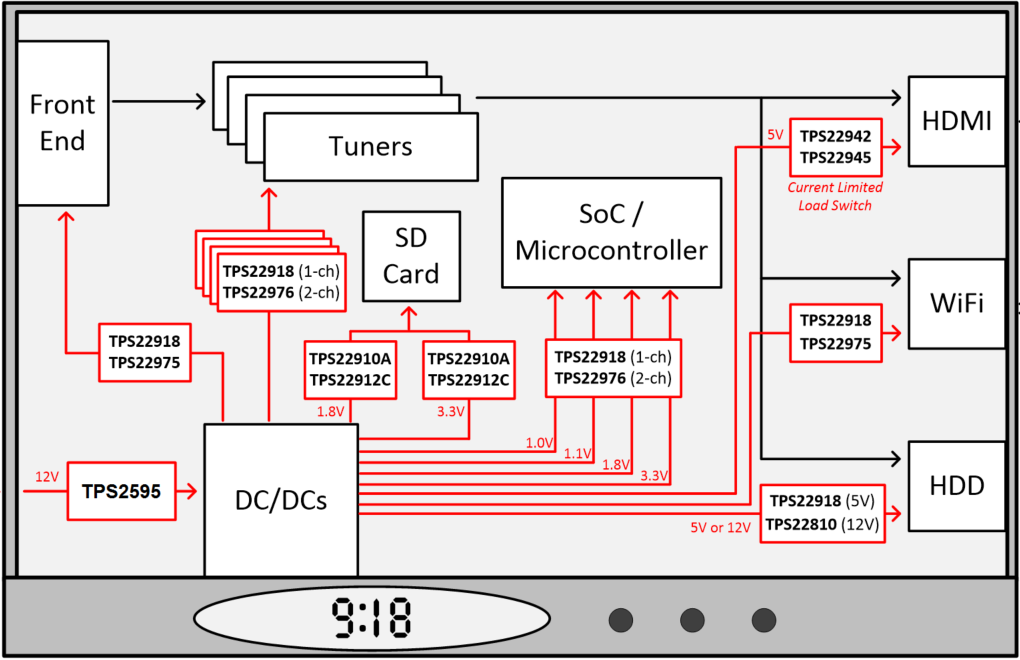 ·전원 시퀀싱: 셋톱박스를 제어하는 시스템온칩(SoC)이나 마이크로컨트롤러는 각기 다른 전압 레일에 대해서 특정 파워온 시퀀싱을 필요로 한다. TPS22918이나 TPS22975와 같은 제품을 사용함으로써 각 레일을 순서대로 켤 수 있다.
