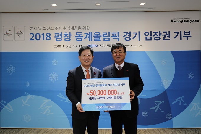 한국남동발전(사장 직무대행 손광식)은 오늘(5일) 진주 본사에서 경남사회복지공동모금회에 평창동계올림픽과 패럴림픽(이하 동계올림픽) 경기입장권을 기부했다. 이번 기부는 동계올림픽 붐 조성에 기여하고, 취약계층 등 지역사회에 동계올림픽 경기관람 기회를 확대하기 위해 진행됐다.