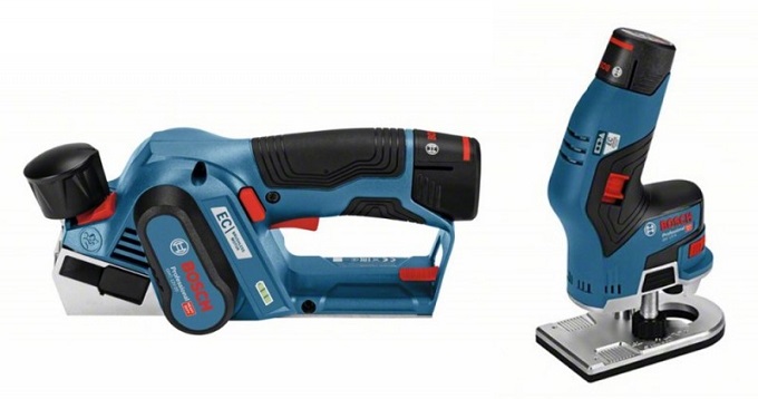 ▲ 왼쪽부터 10.8V 목공 공구 전동 대패 'GHO 10.8V-20'와 엣지 루터 'GKF 10.8V-8'