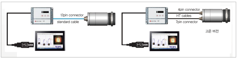 USB 통신 케이블을 컴퓨터와 연결해 전용 소프트웨어를 열고 모든 센서의 설정값을 세트업하고 비디오 조준하여 공정에 대한 모니터링을 할 수 있다. 섭씨 50℃의 온도에서부터 섭씨 2200℃까지 고온의 목표물에 대한 온도를 정밀하게 측정할 수 있다. 측정 속도는 측정 애플리케이션에 따라서 1/1000초부터 수십 초까지 조절할 수 있다.
