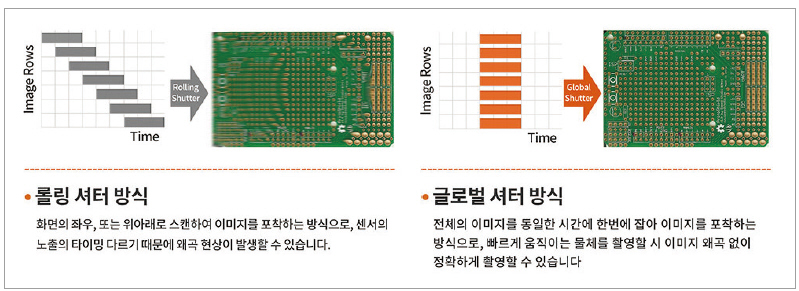 VG 시리즈의 또 다른 장점은 외산 제품과 견주어도 손색없는 성능에 있다. 산업용 카메라인 비전센서는 촬상 능력이 무엇보다 중요하다. 이에 VG 시리즈는 전체를 한 번에 잡아 캡처하는 방식인 글로벌 셔터 방식을 채용했다. 이는 화면의 좌/우, 또는 위/아래로 스캔하여 캡처하는 롤링 셔터 방식에 비해 왜곡 현상이 덜 발생하기 때문에 움직이는 물체를 촬영할 때 잔상 없이 정확하게 촬영할 수 있다. 실제로 빠른 속도로 움직이는 공정 라인에서 대상을 정확하게 촬상하여 검사하기 위해선 글로벌 셔터 방식이 최적인 셈이다.