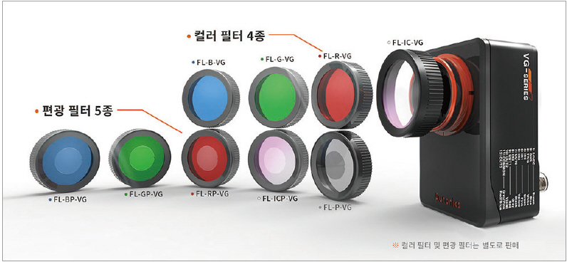 이외에도 VG 시리즈를 통해 저장된 이미지는 설정에 따라, All, PASS, FAIL의 이미지를 구분하여 저장할 수 있고 BMP, JPG, PNG, CSV의 확장명으로 저장이 가능해 데이터의 이력 관리 및 조회, 분석이 가능하다. 또한, 저장된 검사 결과 이미지를 FTP 서버로 전송할 수 있어 비전 시스템의 특징도 함께 누릴 수 있으며, 총 4종의 컬러 필터와 5종의 편광필터를 제공해 정확한 판정이 가능하다.