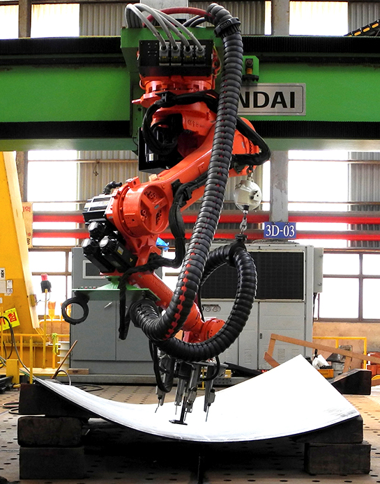 현대중공업은 사물인터넷(IoT)·자동화 기술을 활용해 복잡한 3차원 곡면 형상을 가진 선박의 앞·뒷부분 외판을 자동 성형하는 ‘곡 성형 로봇시스템’을 1년 여간 작업장에 투입해 검증작업을 모두 완료했다고 밝혔다.