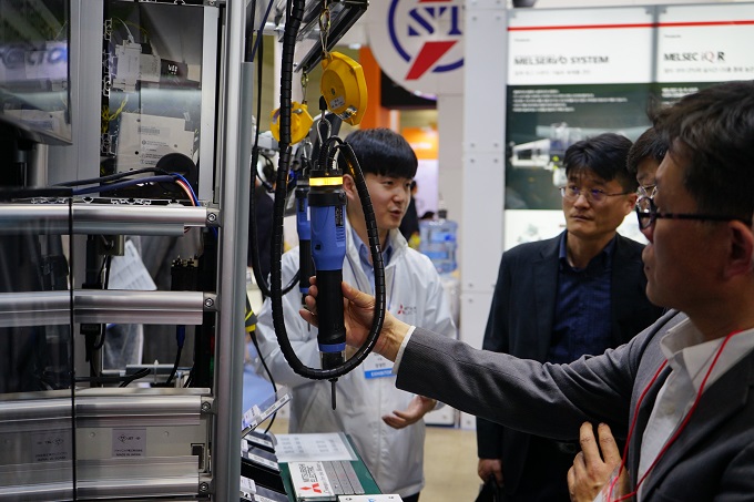 ▲한국미쓰비시전기오토메이션이 작업지원 솔루션을 통해 나사 체결하는 공정을 시연하고 있다.