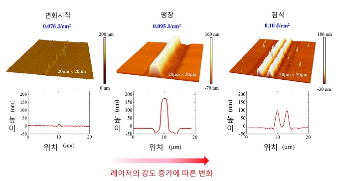 ▲ 연구팀은 펨토초 레이저빔의 강도에 따라 전도성 유기박막의 표면에 나타난 변화를 원자힘현미경(AFM)으로 측정하며 최적의 레이저 조건을 발견했다.