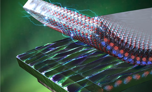 ▲자기장에 의해 변형이 일어나는 자왜 금속 소재(하단의 판재)와 변형에 의해 전기에너지가 발생하는 압전 소재(상단의 원자 구조가 도시된 판재)가 하이브리리 인터페이스 결합 현상을 이용해 일상의 자기장 노이즈를 전기에너지로 변환 시킬 수 있다.