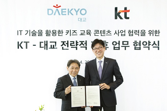 KT(회장 황창규)가 대교(대표이사 박수완)와 지난 26일 서울 종로구 KT 광화문 사옥에서 KT 이필재 마케팅 부문장, 대교 박수완 대표이사 등 양사 주요 임원들이 참석한 가운데 업무 ‘IT 기술을 활용한 키즈&교육 콘텐츠 사업 협력을 위한 업무 협약(MOU)’을 체결했다.