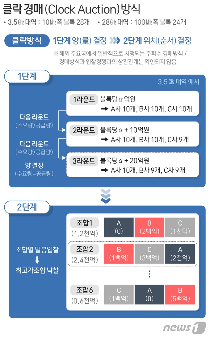 경매는 '클락 경매'(Clock Auction) 방식으로 진행된다. 1단계에서 입찰할 주파수의 '양'을 결정하고 2단계에서 주파수 대역 위치를 정하는 방식이다.