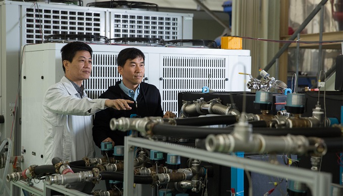 ▲권오경 그룹장(오른쪽)과 박인 수석연구원이 개발한 흡착식 냉동기 시제품의 작동상태를 살펴보고 있다.