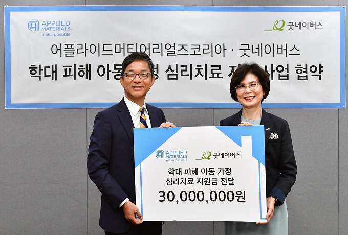 반도체 칩과 첨단 디스플레이 제품 생산에 사용되는 재료공학 솔루션 분야의 기업인 어플라이드머티어리얼즈코리아가 사회복지법인 굿네이버스 (회장 양진옥)와 18일 협약을 맺고, 학대 피해 아동 가정을 위한 심리치료 지원에 나선다.