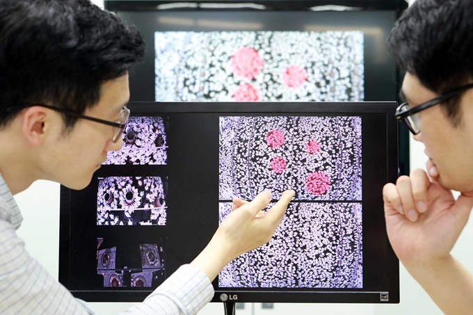 LG이노텍 직원들이 ‘인공지능 양계 스마트팜’ 기술 개발을 위해 양계장의 닭을 네트워크카메라로 모니터링하며 데이터를 분석하고 있다.