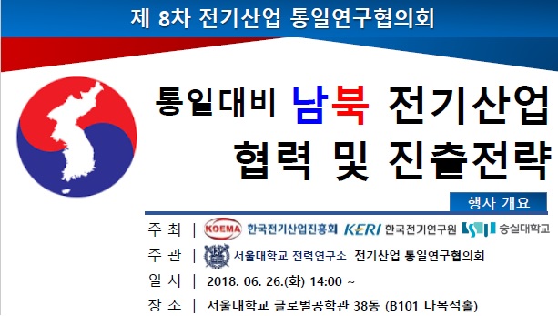 한국전기산업진흥회와 한국전기연구원, 숭실대학교가 공동 주최하고, 서울대학교 전력연구소와 전기산업 통일연구협의회가 주관하는 ‘남북 전기산업 협력 및 진출전략’ 세미나가 오는 6월 26일(화) 오후 2시부터 서울대학교 글로벌공학관에서 개최된다.