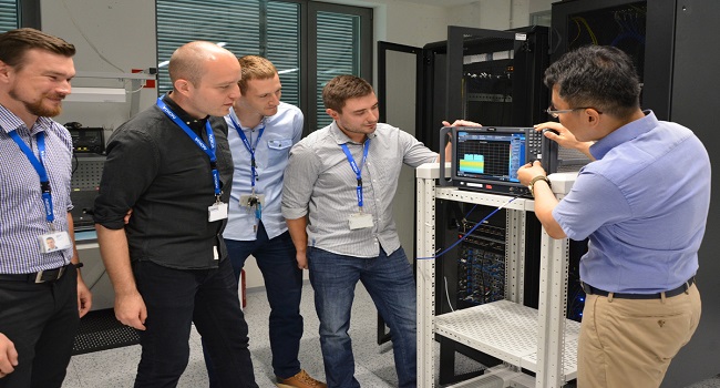 ▲SK텔레콤과 노키아 연구원들이 5G단독 규격 기반 데이터 전송을 시연하고 있다.