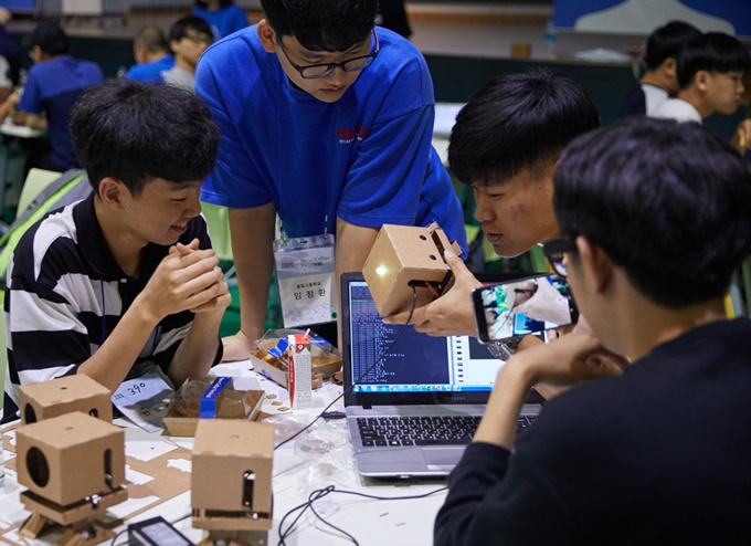 ▲IBM 뉴칼라 페스티벌에 참가한 중고교생들과 선생님들이 IBM 인공지능 왓슨 기술을 사용해 미니로봇을 제작, 구동해보고 있다.
