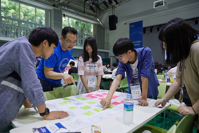 ▲IBM 뉴칼라 페스티벌에 참가한 중고교생들과 교사 및 IBM 임직원들이 IBM 디자인씽킹 방법론을 통해 모바일앱을 기획하고 있다.