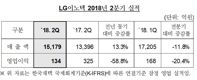 LG이노텍이 한국채택 국제회계기준(K-IFRS)으로 2018년 2분기 매출 1조5179억원, 영업이익 134억원을 기록했다. 전년 동기 대비 매출은 13.3% 증가했고 영업이익은 58.8% 줄었다. 전분기 대비해서는 매출 11.8%, 영업이익 20.4% 감소한 실적이다.