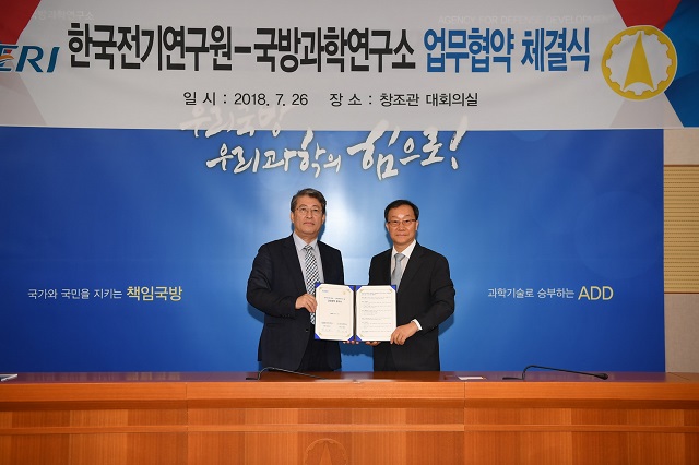 과학기술정보통신부 산하 전기전문 정부출연연구기관인 한국전기연구원(이하 KERI, 원장 최규하)과 국방과학연구소(이하 ADD)는 지난 7월 26일, 미래 국방력 확보를 위한 국산 무기체계 연구개발 및 시험평가 업무협력 협약을 체결했다.